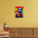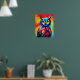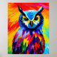 Colourful watercolor owl portrait poster with whimsical art style, nature wall decor.