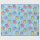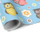 A playful and colourful seamless pattern featuring cartoon owls in various bright colours such as pink, orange, green, brown, and blue. The owls are surrounded by a mix of small, multicolored flowers on a soft blue background, creating a cheerful and whimsical design. Perfect for children's products.