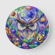 An intricate stained glass window featuring a majestic owl surrounded by vibrant colours, creating a celestial and magical atmosphere.