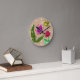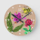 Fun wall clock done in a craft paper looking background, with painted looking doodle flowers and bumble bee. White numbers and dots for the hours, decorate the edge of the clock. Customise to add any text you want. Makes a cute gift idea.