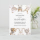 A gentle gathering of pajama-clad baby animals encircles a dreamy invitation scene, each character radiating warmth and charm. With pastel tones and playful expressions, the design evokes a sense of innocence and joy, perfect for marking a tender milestone. The composition balances whimsy and elegance, inviting guests into a world of cuddles, laughter, and heartfelt celebration. This design is gender neutral.