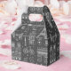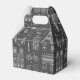Whimsical favour box / small bakery box pattern features all the best of Paris life, from the Eiffel Tower and Arc de Triomphe to bistro seating and macarons. White doodles on chalkboard grey background.