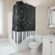 A whimsical musical design with curved piano keyboard keys and musical notes on a subtle flourish pattern in grey on a black background. Ideal for the pianist, piano student or the piano lover.
