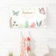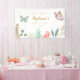 Whimsical butterfly baby shower welcome banner featuring illustrations of pink and mint butterflies with faux gold edges flying over a colorful flower garden. Customize this product by adding the mother-to-be's name and event date.