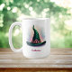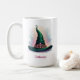 Whimsical witch coffee mug, featuring an elegant green witch hat adorned with sparkling pink jewels and a whimsical crown. Perfect for fans of musical fantasy and enchanted celebrations, this design is sure to impress.