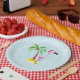 Paper plates with a whimsical drawing of a pink flamingo wearing a red santa hat. Standing on a mound of yellow beach sand with a green and brown coconut palm tree in the back. Light blue background with a faint polygonal pattern. Cute and fun festive tropical design.