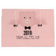 A large gift bag celebrating the Chinese New Year. A big pink pig face wearing a formal bow tie. Lifted up by his black cloven hooves and peering over a table. Cute and whimsical drawing. Set on a pink background with faded hearts. Ready to celebrate the year of the pig 2019.