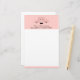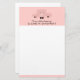 Stationery paper with a drawing of a cute pink pig's face. Wearing a black bow tie. Lifted up by his black cloven hooves and peering over a table. Cute and whimsical drawing. Set on a pink background with some faded hearts here and there.