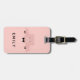 A luggage tag personalised on the front and your personal info on the back with a drawing of a cute pink pig's face. Wearing a black bow tie. Lifted up by his black cloven hooves and peering over at you. Cute and whimsical drawing. Set on a pink background with some faded hearts here and there.