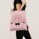 Tote bag with a drawing of a cute pink pig wearing a bow tie. Lifted up by his black cloven hooves and peering over a table. Cute and whimsical drawing. Set on a pink background with faded hearts.