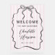 A simple handwritten script modern pinstripe with bow, doodle wedding welcome sign. For a simple, minimalist, casual, fun, wedding stationery style. Black typography on pale pastel pink pinstripes. A relaxed casual wedding doodle style, leaning a bit towards a cute romantic Parisian whimsicalcore style with a hand drawn vibe.