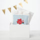 Whimsical scarf wearing polar bear juggling presents on his hind feet. Teal, red and white graphic on light blue background gives it a retro holiday feel.