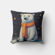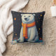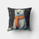A charming polar bear sits on snowy ground, wearing a bright orange scarf, beneath a dark star-filled sky. Whimsical and cozy, perfect for children's books or festive gift themes.