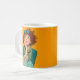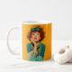 A vibrant illustration of a dreamy redheaded girl with bright blue eyes, wearing teal and polka dot attire, holding a newspaper. Set against a bold orange background, her curious gaze and playful style evoke a retro-modern charm. Perfect for prints, accessories, and quirky designs.
