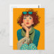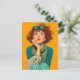 A vibrant illustration of a dreamy redheaded girl with bright blue eyes, wearing teal and polka dot attire, holding a newspaper. Set against a bold orange background, her curious gaze and playful style evoke a retro-modern charm. Perfect for prints, accessories, and quirky designs.