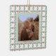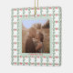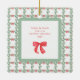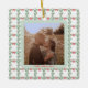 This stunning, vintage style holiday ornament features a colourful, whimsical Christmas design. The front of the ornament features your favourite personal photo, and a matching red and green retro holiday pattern with a white background makes up the outer frame. On the back, a bright red trendy bow decorates the centre along with your name and your special date.