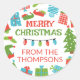 Whimsical Christmas gift stickers letting your friends and relatives know the Christmas gift is from you and your family. With a whimsical retro design inspired by quirky 50s cartoons, the Merry Christmas sticker features Christmas trees, wrapped Christmas gifts, holly, an elf hat, elf shoes and colourful Christmas lights. Personalise with your name!