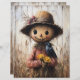 A cheerful scarecrow adorned with a hat and holding bright sunflowers, accompanied by a perched crow, set against a wooden background and rustic agricultural scenery.