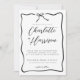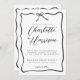 A simple handwritten script modern minimalist black and white typography wedding invitation framed with a wavy ribbon frame with bow in a hand drawn style. Informal whimsical coquette style. Available in print, as a digital download, or both.