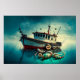 Whimsical Shrimp boat and colourful shrimp at sea.