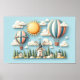 A delightful illustration that captures a playful, vintage-inspired scene in a cute, Flat 2D stylised style. Two charming hot air balloons float serenely through a sky filled with puffy, cartoonish clouds. A big, round sun beams cheerfully, adding warmth to the overall composition. Below, the landscape is dotted with rustic windmills and pine trees, creating a quaint countryside feel. The entire scene is rendered in bright, pastel colours, giving it a fresh and inviting appearance. The design embraces a 2D plastic aesthetic, with clean lines and simplified shapes that contribute to its whimsical and bubbly characteristics.