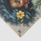 A spring collage with deep, dreamy shades of blue, blending stormy indigo and misty aqua. This mixed media art features an ethereal African American girl with luminous eyes, surrounded by tropical flowers like hibiscus and orchids. Her dark, windswept curls intertwine with cascading vines, creating a scene of natural beauty and quiet introspection.