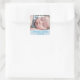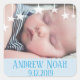 Personalised new baby boy blue background, baby photo, name and birth date stickers.
