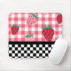 Whimsical Spring / Summer themed mousepad features top half of red and pink strawberries on pink gingham and bottom half of black and white checkerboard.