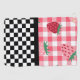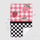 Whimsical Spring / Summer themed golf towel features top half of red and pink strawberries on pink gingham and bottom half of black and white chequerboard.