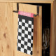 Whimsical Spring / Summer kitchen towel design features top half of red and pink strawberries on pink gingham and bottom half of black and white chequerboard.