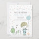 Super cute illustrated whimsical kids birthday invitation of a little boy with blond hair holding a balloon surrounded by nature. All details are customizable while different colored hair and matching party items are also available. See below for this collection.