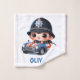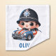 This whimsical towel features a cute little police with a comically large head sporting a classic police helmet, cruising in an open-top police car decorated with the British flag. Personalise it with their name for a unique experience.
