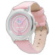Girly pink unicorn personalised watch for girls- Faux sequins glitter unicorn at top in girly pastel shades of purple, pink, and blue framed by feminine, faux pink gemstones and hearts with metallic silver border and pink bow at bottom. Custom name in white overlaid on monogram initial in pink. Both solid pink background colour and monogram colours may be changed. White clock face numerals. Cute personalised gift for little girls.