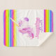 Personalised unicorn head watercolor whimsy art on a graphic pink rainbow stripe background. Customise with your own choice of first name and family names or other details. Original watercolor mythical unicorn purple and pink art and design by Sarah Trett for www.mylittleeden.com on Zazzle.