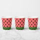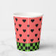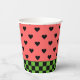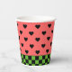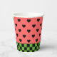 Whimsical paper cup features watermelon pink and black hearts pattern with dark green chequerboard bottom border.