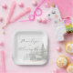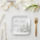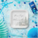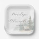 These paper plates feature a whimsical winter scene with a cozy cabin nestled among tall pine trees, creating a serene and romantic atmosphere. The design uses soft watercolor techniques with a palette of whites, light grays, and muted greens, evoking a dreamy snowy landscape. Elegant script typography adds sophistication, making these plates perfect for weddings or special occasions. The overall mood is tranquil and nostalgic, ideal for celebrating moments in a peaceful setting.