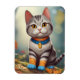 Featuring a captivating striped cat adorned with bright blue and orange socks and a vibrant collar with a golden emblem, this artwork radiates a playful yet serene vibe.