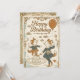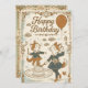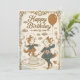 This vintage-inspired birthday card features two charming anthropomorphic foxes celebrating joyfully in a whimsical woodland setting. Rendered in a sepia and sky-blue palette on textured aged paper, the design showcases intricate decorative borders, floral flourishes, and fantasy elements such as smiling suns, floating clouds, and delicate scrollwork. The playful scene includes a tiered cake, a balloon, and joyful expressions, all under the bold and beautifully hand-lettered "Happy Birthday" greeting. The illustration blends nostalgic fairytale aesthetics with a soft, heartwarming mood, perfect for evoking childhood magic and timeless celebration.