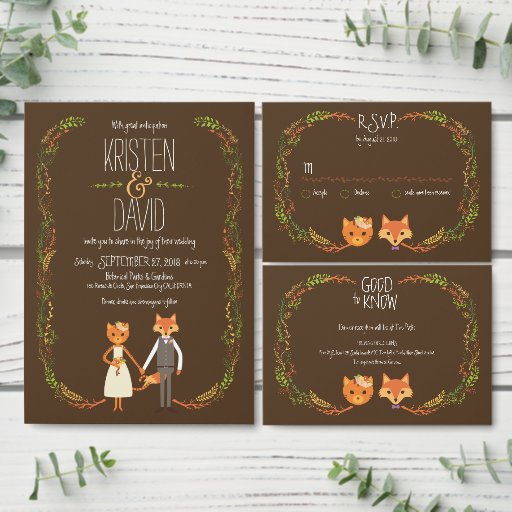 This charming wedding invitation collection features a hip cat and fox couple surrounded by a frame of hand-drawn forest leaves in a wreath arrangement.