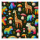 This vibrant pattern features a delightful arrangement of giraffes, bears, and mushrooms, all illustrated in a colorful style against a dark military green background. The seamless design offers a playful and whimsical aesthetic, making it ideal for a variety of applications, such as textiles, wallpapers, and stationery. The combination of animals and mushrooms creates a charming woodland theme, appealing to both children and adults who appreciate nature-inspired art.