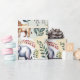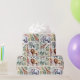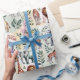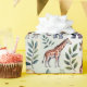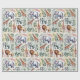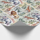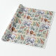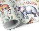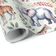 Whimsical wrapping paper featuring elephants, lions, and giraffes among green leaves and branches, creating a playful, safari-themed design.