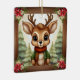 Whimsical Xmas Reindeer Holiday Decoration, rustic square ceramic ornament featuring a brown wooden frame, with Christmas poinsettia flowers and a cute baby forest animal, unique deer with antlers in a cartoon graphic art style wearing a jacket and scarf, standing in the foreground. Wintry trees, complete the winter season charm of this woodland wildlife doe character illustration, making for a great gift. Fawn lover design is on front and back. So no matter how the hanging decor turns, it always looks festive and complete. Get yours today!