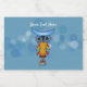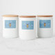 This custom label for a food jar has a whimsical abstract owl with a blue head, yellow body, and colourful feathers and tail on a blue background with circles and dashes in shades of blue. Customise your text with the template.