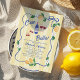 Ciao bella hand drawn bridal shower invitation featuring a quirky blue frame, lemons, wine bottle and glasses on a yellow striped background.