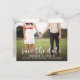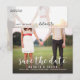 Whimsical and stylish save the date announcement with photo featuring white modern calligraphy script.