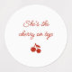 This “She’s the Cherry on Top” label design is sweet, playful, and perfectly scaled for jars, bottles, or small packaging. Featuring bold red script at the center with a cheerful pair of hand-drawn cherries beneath, the clean red-on-white layout keeps the design modern and whimsical. Its simplicity makes it instantly recognizable as part of the “She’s the Cherry on Top” collection, while leaving room for the product or favor itself to shine. Ideal for bridal showers or cherry-themed celebrations, it’s a stylish, cohesive addition to your party favors or gift packaging.