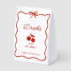 Add a playful and stylish touch to your bridal shower drinks table with this “She’s the Cherry on Top” sign. Featuring bold red script in a whimsical, retro-inspired font, the layout is accented by a sweet pair of hand-drawn cherries and a small bow for extra charm. Set on a crisp white background, the design is clean, airy, and easy to read across the table. Perfect for labeling cocktails, mocktails, or other beverages, it can also be personalized with the bride’s name, event date, or a short message. This cheerful, cherry-themed sign ties seamlessly into the “She’s the Cherry on Top” collection, adding a fun and coordinated finishing touch to your celebration.