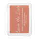 Whimsy Save the Date Magnet in orange and white with a simple and fun script typography design. This trendy save the date magnet is easy to customise with your wedding details. For more customisation options, click on the Customise It button.