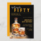 The invitation features a prominent "Aged to Perfection" headline, immediately establishing the theme and celebrating the milestone birthday. The word "FIFTY" is displayed in a large, bold font, making it the focal point of the design. A captivating watercolor-style illustration of a bottle of bourbon and a filled glass with ice takes centre stage, evoking the rich amber hues and inviting aroma of fine whiskey. The event details, including the date, time , honoree's name and venue are presented in a clear and legible font, reminiscent of classic magazine layouts. The RSVP information is also clearly displayed.