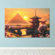 A captivating fantasy artwork depicting a tranquil sunset over a serene river, where a traditional Japanese bridge gracefully curves, framed by vibrant cherry blossoms and lotus flowers. A majestic temple and red torii gate stand proudly, while a massive pyramid looms in the background, blending ancient cultures into a harmonious scene. The warm glow of the setting sun casts golden shadows over the scene, creating an atmosphere of serenity and tranquillity. Perfect for lovers of cultural fusion and serene beauty, this piece is ideal for home decor or as a special gift.